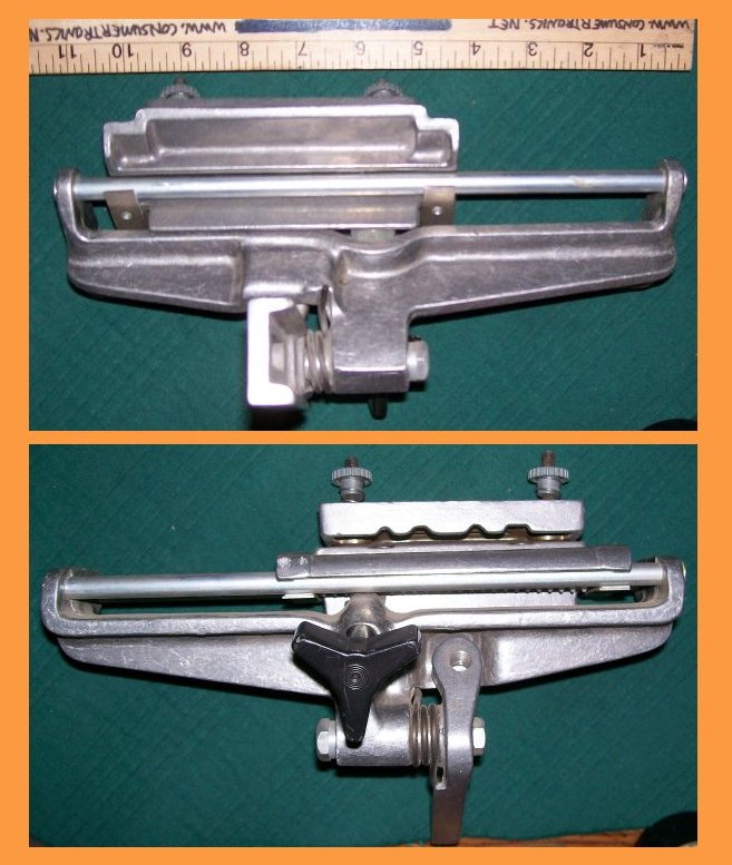 Used and in great condition. We don't know what these "V" clamps were originally designed to do. Each clamp system consists of a trough-like structure that is 11-1/2" long and 1-5/8" wide at the top which tapers down on all sides to about 9" long and 1/2" wide at the bottom, and about 1-1/8" deep. Each has two sliding clamps with it. At the bottom is a clamp that slides along a slot at the very bottom, and that tightens using two knobs, and that looks like it clamps to a flat rail or bar of some type. The top clamp slides along and above the top lip of the trough, and is used to clamp down whatever you are working on or want to secure in the trough. These things look like they are used to hold down or secure something in the trough perhaps for soaking, washing, cleaning, grinding, polishing, machining, painting, carving, soldering, etc. They look like they were originally designed for some type of photographic, jewelry-making or laboratory purpose, but can be further adapted for many general shop, craft, hobby, model-making, etc. uses. We do not know the make or model or age. This is a kind of tool which has many uses, is very versatile, but when you need it virtually nothing will substitute for it. If you know what these things do, please let us know.